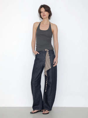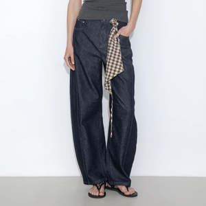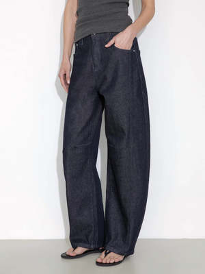 Panelled loose-fit wide-leg tapered jeans in blue/white. Features a relaxed, tapered silhouette with wide legs and curved panel details for added shape. Concealed fly and button fastening for a sleek finish. The fabric composition is 75% cotton, 21.5% polyester, 2% viscose, 1.5% spandex.