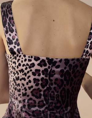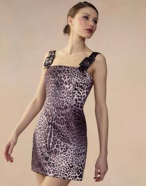 Little leopardess satin dress with buckle strap details. - Square neckline - Invisible back zipper - Fitted silhouette with pleated empire waist - Buckle straps with crystal details - All over leopard print - Fabric content: 100% polyester - Care instructions: dry clean recommended Fit: model is 5'10" and wears a size 2. Size 4 measurements: - Length from center back: 26.5" - Length from shoulder: 33" Complete the look: Leopard Satin Safari Jacket
