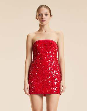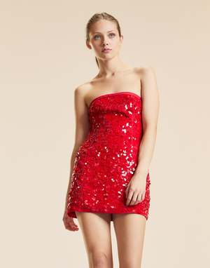 Sequin mini dress perfect for a Valentine's look or cocktails on the town. - 100% Polyester - Slim fit - Stretch - Detachable tie belt - Dry clean only - Fit: model is 5'9" and wears a size 2 - Size 2 length: 25"