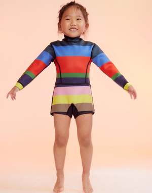 1.55 MM Fiber-Lite Neoprene. - Stripe print - SPF 50+ - Covered back zipper with velcro flap at neck - Bonded seams - Fabric content: 80% neoprene, 20% nylon - Care instructions: hand wash cold, hang or lay flat to dry Fit: model is 2 and wears a size 3-4Y. Size 3-4Y measurements: Length from shoulder: 18" Our wetsuits and neoprene swim styles are made using green technology, contributing to a gentler environmental impact. By using earth mined limestone in place of petrochemicals, and recycled materials such as tires and plastic bottles, water resources are conserved and carbon footprint is significantly reduced. We are proud to create eco-friendly products that can be enjoyed across oceans world-wide. Our wetsuits are produced in limited-edition runs, when they sell out they are gone forever.
