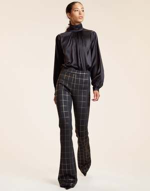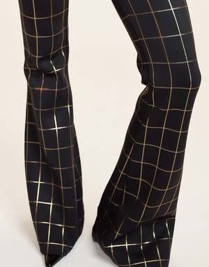 Fit-and-flare pants made from bonded material featuring a unique metallic print. Flattering, unbelievably comfortable, and easy to style in endless ways. - Composition: 86% polyester, 14% spandex - Unlined - Fitted throughout the leg with slight flare - Exposed zipper detail at center back - High-rise - Stretch - Machine wash cold, hang dry - Fit: model is 5'9" and wears a size 4 - Size 4 measurements: - Inseam: 33" - Length: 44"
