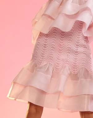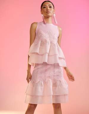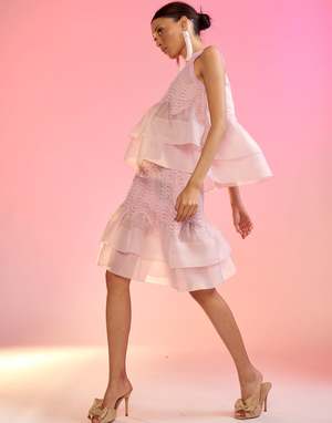 Light pink organza lace embroidered skirt. - Midi length - Organza ruffle tiered hem - Wavy lace with rich texture and layering - High waisted - Fully lined - Midi length - Invisible zipper - Fabric content: 100% polyester - Care instructions: hand wash, hang to dry Fit: model is 5'11" and wears a size 0. Measurements from size 2: - Length down back: 24" Complete the look: Amelia Organza Top Age group adult Google product category Apparel & Accessories > Clothing > Pants Condition new Custom product false Gender female Color pink Material organza Size 0/2/4/6/8/10 Size system US Size type regular