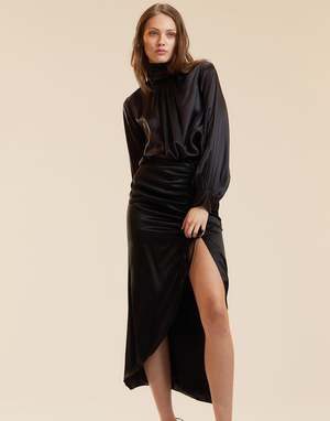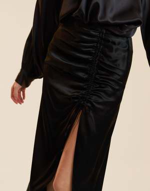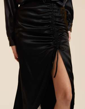 This skirt does all the talking. A go-to for nights that call for a little attention. - Composition: 100% Silk - Unlined - Dry-clean only - Concealed side zipper - Midi length with front slit - Adjustable ruching at front - Mid rise - Model is 5'9" and wears a size 2 Measurements (size 2): - Length: 36.75 - Waist: 26