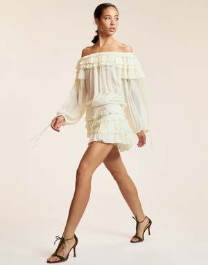 Unlined blouse with a pull-on style and off-the-shoulder neckline. Features a relaxed, loose fit with adjustable elastic drawstring at the bottom hem and cuffs for added comfort and stretch. Dry clean only. Fit: Model is 5'9" and wears a size S. Size S measurements: - Length: 17" - Sleeve length from shoulder: 22.5" - Chest: 60" - Neck Elastic (Relaxed): 33" Composition: 100% Polyester.