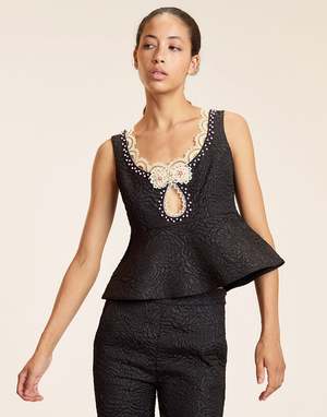 Inspired by the prettiest dessert, this top is crafted from soft, breathable brocade and finished with lace trim, delicate beaded embroidery, and a keyhole cutout. - Composition: 100% Polyester - Lined - Concealed center back zipper - Round scoop lace trim neckline with a keyhole cutout detailing - Cropped peplum fit - Stretch - Dry clean only Fit: Model is 5'9" and wears a size S. Full length from shoulder seam: 20"
