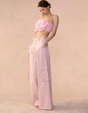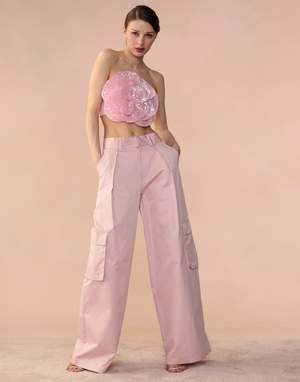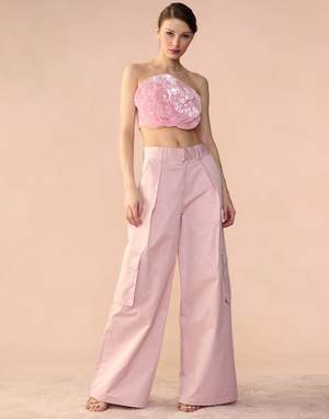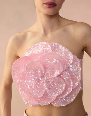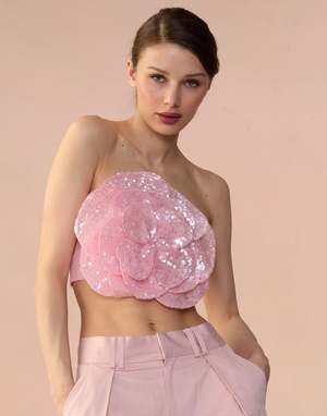 Light pink all over sequin flower bandeau top. - Oversized 3D appliqu sequin flower - Strapless bandeau style top - Fabric content: 100% polyester - Care instructions: dry clean only Fit: model is 5'10" and wears a size S. Complete the look: Marbella Cotton Cargo Pant