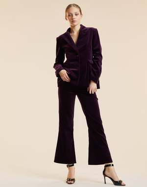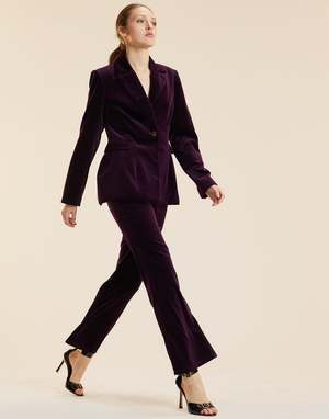 Velvet suit blazer designed for a bold, head-to-toe look. - 100% cotton - Dry clean only - Pockets - Model is 5'9" and wears a size 2 - Sleeve length: 23.75" - Neck drop: 14.25" - Length: 26"