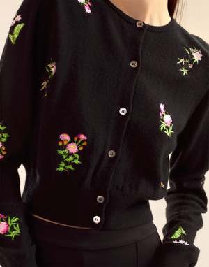 Pretty floral embroidered baby cashmere cardigan. Cute enough to wear solo, but also great for layering. Your new year-round go-to when youre looking for a hint of girly style (without trying too hard). Spring/Summer 25' Composition: 70% Wool, 30% Cashmere Hand wash, hang to dry Fit: Model is 59 and wears a size S Size S Measurements: Length: 19"