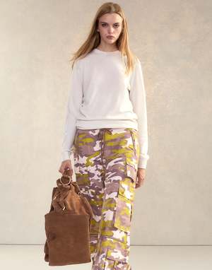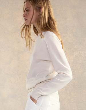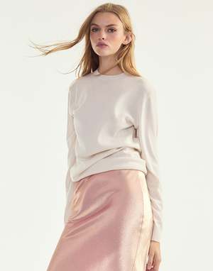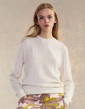 Off white wool and cashmere crewneck sweater - Classic crewneck - Ribbed neckline, cuffs and hem - Soft wool cashmere blend - Lightweight knit for all seasons - Fabric content: 70% wool, 30% cashmere - Care instructions: hand wash, hang to dry Fit: model is 5'9" and wears a size S. Complete the look: - Shimmering Siren Skirt - New Cargo Pants coming 10/10