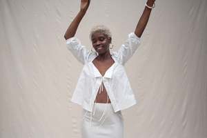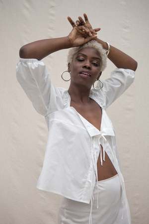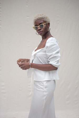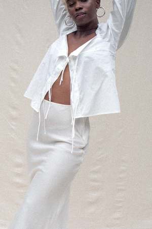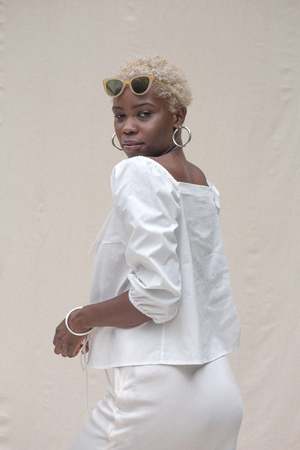 A versatile tie-front top with puff sleeves and a slightly cropped length. Includes a small sewn-in tack to keep the front closed at the bust, which is easily removable so it can also be worn tied open. Made from organic, locally sourced poplin. Fits true to size model wears small. Made in Los Angeles.