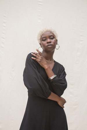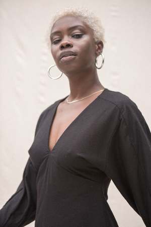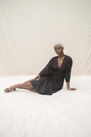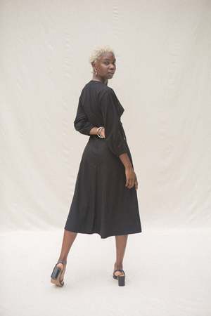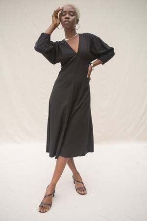 Inspired by cool nights spent outdoors in those late summer evenings. Deep V front silk noil dress with seamed puff sleeve and zip closure back. Midi length with a tapered waist. Made from sustainable silk noil, a textured easy-care silk that can be hand or machine washed. Measurements: XS - Chest 30, Waist 26, Length 46 S - Chest 31.5, Waist 27, Length 46.5 M - Chest 32, Waist 28, Length 47 L - Chest 32.5, Waist 29, Length 48 Model is a size small (size 4), 57. Please size up one size if you would like a more relaxed fit.