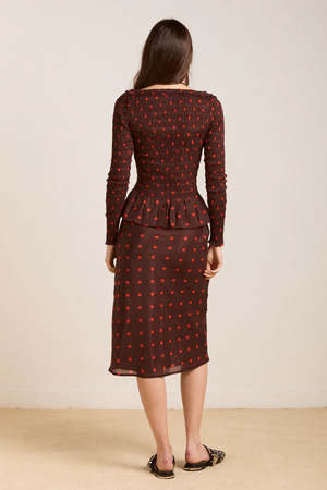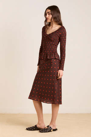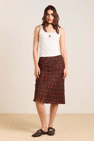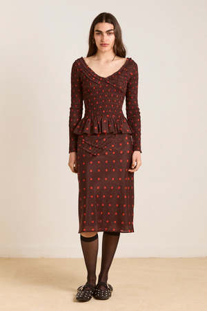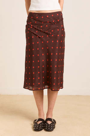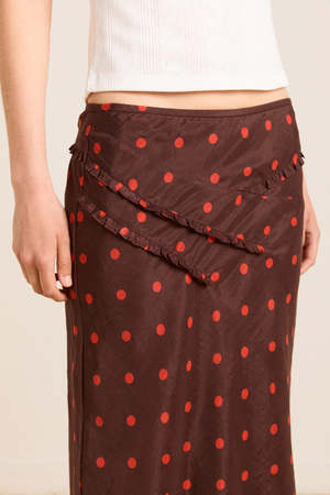 The Octavia Knee Length Skirt in burgundy/red polka dot delivers an effortlessly flowy drape with a comfortable elasticated waistband. Adorned with ruffle detailing and an all-over polka dot print, this midi length skirt is a statement. Pair with the matching blouse and headscarf. Midi length Elasticated waist Lined skirt Ruffle detail on front Matching top and accessories available Select your regular size 51% LENZING Lyocell, 49% cotton Designed in London Made in India Model is 5'9.5 and is wearing a UK 8.
