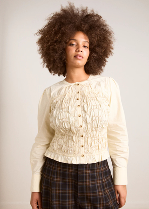 Meet your new everyday statement piece. Crafted from 100% organic cotton, this blouse features a beautifully smocked bodice that creates a flattering, fitted silhouette. A soft crew neck is finished with a delicate tie detail, while a full button-down placket and cuff buttons add refined structure. Smocked bodice Buttons at cuff Tie at neck Crew neck Fitted Button-down placket Select your regular size 100% organic cotton Made in India Designed in London Franny is 5'10 and is wearing a UK 10. Kora is 5'10 and is wearing a UK 14.