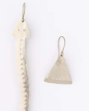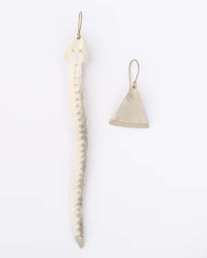 Asymmetrical lightweight metal earrings featuring a snake-shaped earring (approx. 4.5" / 11.5 cm) and a triangle-shaped earring (approx. 1" / 2.5 cm). Hammered texture with a polished finish. Made from non-plated nickel silver. Sold as a pair. Handcrafted in Paraty, Brazil. All jewelry is non-returnable.