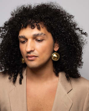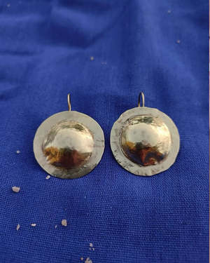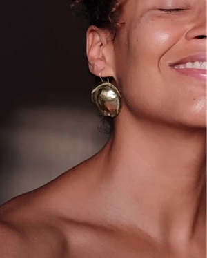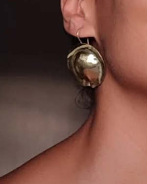 Dani Guirra is a jewelry designer based in Paraty, Brazil. For over a decade, she has explored manual craftsmanship rooted in Black heritage, transforming it into meaningful body adornments. Each creation is informed by the cultural contributions of African and Indigenous peoples to the Americas, serving as a vessel of storytelling and celebrating Afro-Brazilian identity. These super light metal earrings are round-shaped with an inner dome, featuring a fixed hook, hammered texture, and polished finish. Made from brass. Approximate diameter: 1.5 / 3.5 cm. Sold by the pair. Handcrafted in Paraty, Brazil.