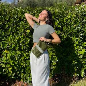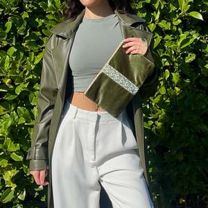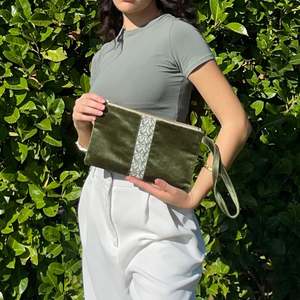 The Velvet Tatreez Clutch is 100% hand-embroidered and handcrafted in Palestine. This wristlet features a pouch measuring 10" x 6.5", lined with cotton fabric, a zipper closure, and a permanently attached wristlet strap.