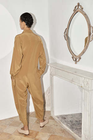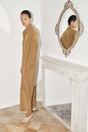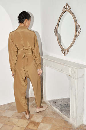 - Wide waist - Separate band to fit on waist or hips - Shirt Collar - Centre front hidden button closures - Inseam pockets - Full-length sleeves with pleats and button cuffs - French seam finish - Colour: Tan - One size fits all S/M/L - 100% Pure Silk. Crepe de Chine (Italy) MADE IN SPAIN