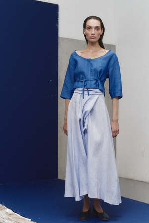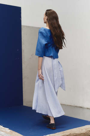 The Alma Skirt by Datura is a multi-style skirt featuring long attached bands that can be fitted at the front or back. It can be worn very high waisted or a little lower on the waist, with a V-shaped open front slit. The skirt adjusts on the hips or waist and features French seaming. Color: Cloud (Light Blue). One size fits S/M/L. Model is 1.77m (5'9"). 100% Organic Linen. Made in Spain.
