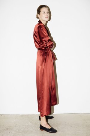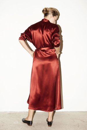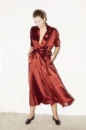 - Dress/Jacket Kimono style - Triangular silk georgette sheer panels on sides - Separate waistband fits for comfort - Inside ribbon to adjust waist - French seaming - Colour: Ruby Red - One size fits all (S/M/L) - Model is 178cm /5 '10" - 100 % Pure Silk. Satin MADE IN NEW YORK CITY
