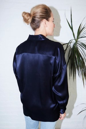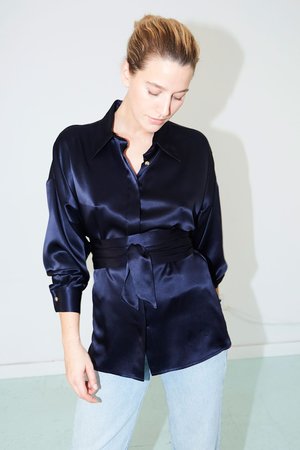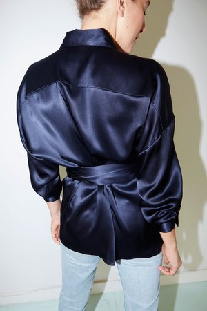 - Shirt Collar - Separate band to fit on waist or hips - Centre front hidden button closures - Binded mini-overlock seams - Full-lenght sleeves with pleats and button cuffs - Colour: Blue Moon - One size fits all (S/M/L) - 100% Pure Silk. Satin MADE IN NEW YORK CITY