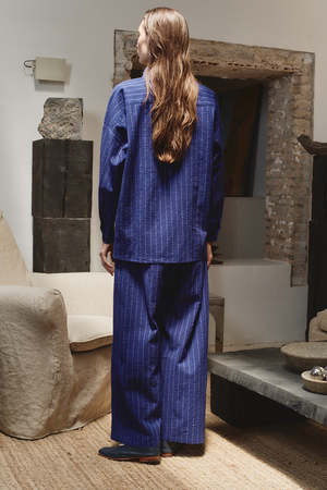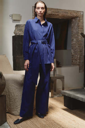- Shirt collar - Separate band to fit on waist or hips - Centre front hidden button closures - Binded mini-overlock seams - Full-length sleeves with pleats and button cuffs - Colour: Indigo Blue with pinstripes - One size fits S/M/L. Model is 182 - 510" - 100% Organic Seersucker Spanish Cotton Made in Spain.