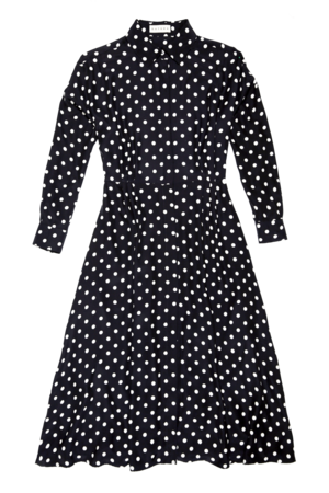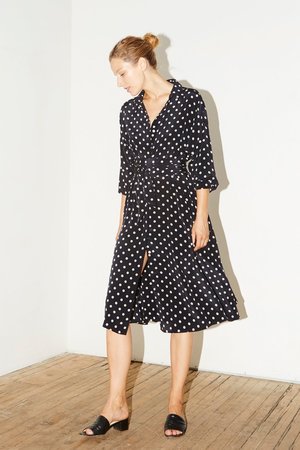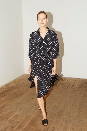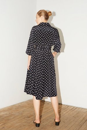 Wide gathered waist Separate band to fit on waist Shirt Collar Centre front hidden button closures Inseam pockets Full-length sleeves with pleats and button cuffs French seaming Colour: Polka (Night Blue/Ivory) Model is 177cm/5 '10" wears size 1. Size 1 (S,M,L) 100% Silk. Crepe de Chine MADE IN NEW YORK CITY
