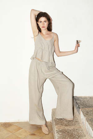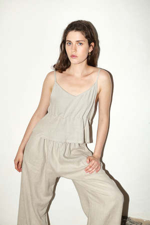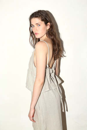 - Slip top that can be adjusted by knotting the bias linen straps in a loop at the back. - Straps can be tied straight or crossed. - Back straps to adjust and gather front and back waist. - Linen bias finishes on neckline and armholes - Short sleeve with a loose fit. - Silk bias finishes on neckline and armholes - Binded clean mini-overlock seams - Colour: Piedra - Model is 175cm /5 '7" (One Size fits S,M,L) - 100 % Spanish Heavy Organic Premium Linen ALSO AVAILABLE IN WHITE LINEN, EMAIL US TO BUY MADE IN SPAIN