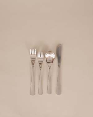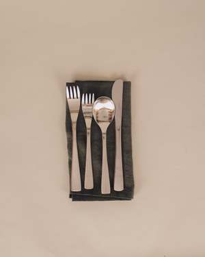 The Cafe Flatware Set by David Mellor is a four-piece stainless steel cutlery set designed in the 1960s as an affordable, everyday option of high quality. Ergonomically designed for comfort and functionality. Set includes: - Knife: 8.5 in - Fork: 8 in - Dessert Fork: 7 in - Dessert Spoon: 7 in Made from stainless steel with a satin finish. Produced in Sheffield, England. A classic workhorse for everyday dining with modern midcentury elegance. Manufactured in small production by a specialist team of craftsmen with expertise in metalwork.