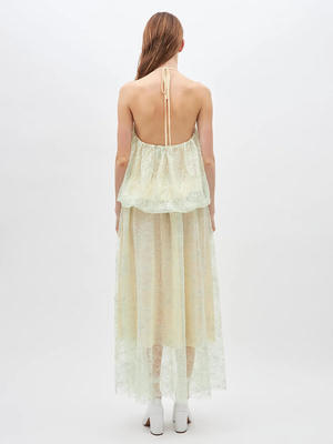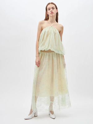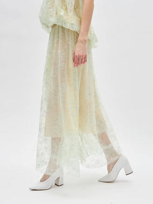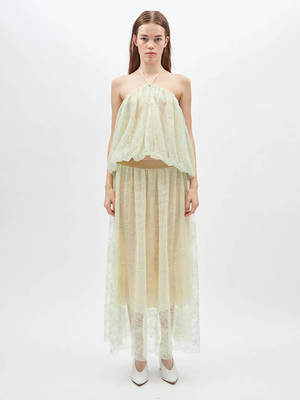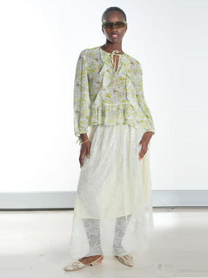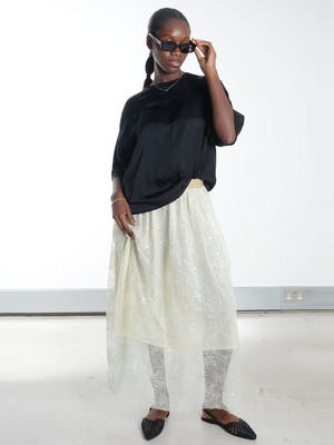 Dazzle in Dawn x Dare's sequin and lace Rennes skirt. This floaty silhouette is crafted from delicate lace, patterned with silver threads. It has an easy pull-on waistband and a 3/4 length lining, so that the fabric falls sheer under the knee. Wear this full length style with a dressy top or a crisp white shirt with heels for an occasion, or with your favourite T-shirt for a more casual look. - Sequin embellished skirt - Pull-on elasticated waistband - 3/4 lined - Sheer from knee - Maxi length Composition: 95% Polyester, 5% Lurex. Care: Dry clean only.