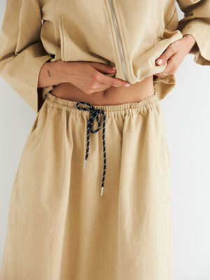 The Amber Skirt from DAWN X DARE is crafted from 100% organic cotton and features a sophisticated drape with refined pleats. Finished with an elasticated drawstring waistband, the Amber Skirt is adjustable and comfortable, perfect for everyday wear. Details - Low waist - Adjustable drawstring waistband - Relaxed fit Composition: 100% Organic Cotton.