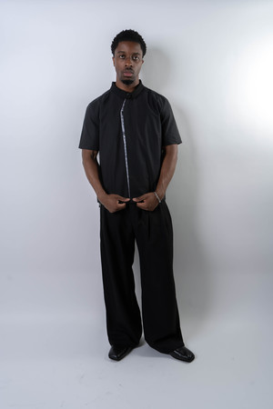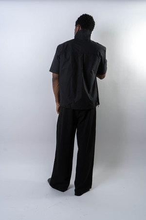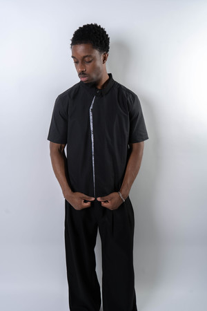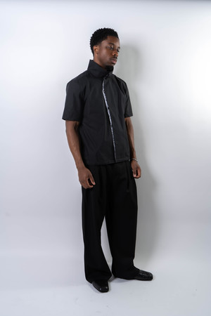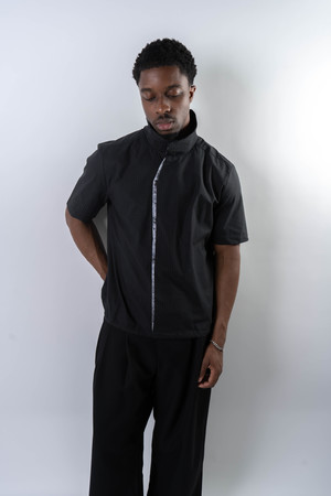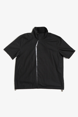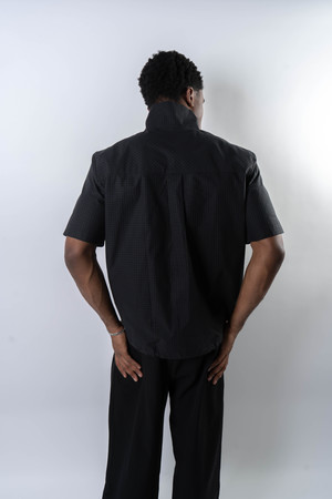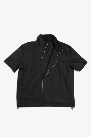 Fitted shirt made from a lightweight cotton fabric with subtle sheen and a fine check pattern. Designed with a sharp double-layer, two-tone placket and a stand collar that references East Asian tailoring aesthetics. Features snap-button closure and an adjustable drawcord hem to shift the silhouette. Structured yet breathable, combining detail with quiet refinement. 100% Cotton Made in China Sizing - Regular fit - Model is 5'11" / 154 lbs, wearing size M Size (CM) S M L XL 1/2 Chest: 55 57 59 61 Shoulder: 44 46 47 49 Sleeve: 22 23.5 25 26.5 Length: 65 67 69 71 *Measurements are in CM. Manual measurement may result in a 12 cm margin of error.