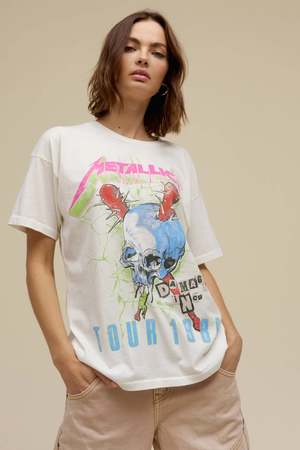 A newbie for your Metallica collectsion inspired by the legends Damage, Inc. Tour in support of their third studio album, Master of Puppets. Featuring an authentic rendition of a skull graphic from the original tour artwork marked with cut and paste, poster like lettering and the groups logo2 center chest. Materials - Made from a 100% cotton fabric, feels like a luxury tour shirt with the perfect drape - A roomy fit t-shirt is like that perfect vintage find, featuring an open neckline and ladder stitch hems - Made in Los Angeles Sizing - Size small measures chest width: 23 1/4", length: 27"
