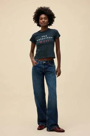 Remembering the renowned rapper, The Notorious B.I.G.'s logo2 stacks on a shrunken fit tee with grinding detail along the hems. This tee is a slightly shrunken style, durably made from heavy weight cotton. Accented with a crew neckline and vintage inspired single needle ladder stitch at all hems. Cut, sewn & crafted in L.A. Model wears size S.