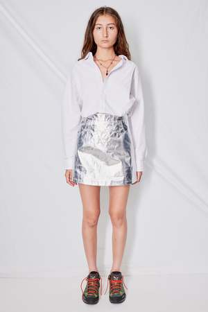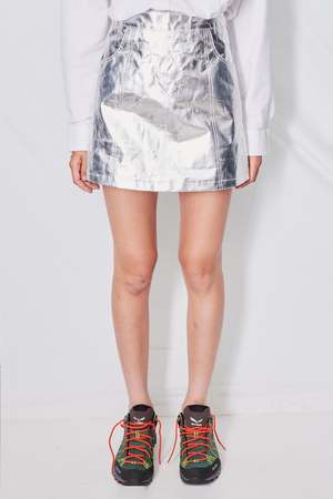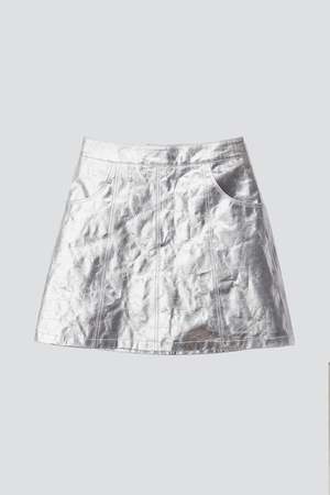 Aluminum Lena Skirt from Deadwood. Mini skirt with an above-knee length. Center zip closure in back. - Recycled woven polyester / Aluminum coating