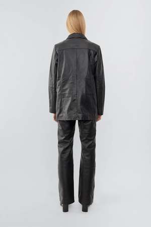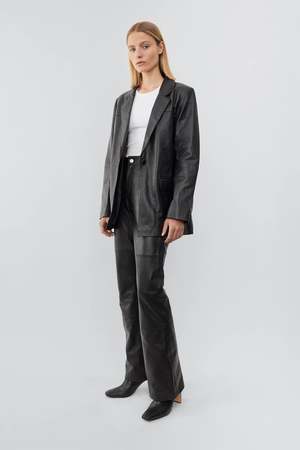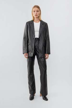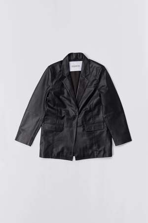 Leather blazer with a beautiful oversized fit, single-button closure. - 100% Recycled leather from leftover material - Lining fabric from recycled plastic bottles Size fit Oversize fit. If you prefer a more classic silhouette we suggest you size down.