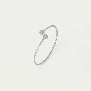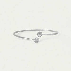 This elegant twist bangle features a minimalist, asymmetrical design accented by two disc-shaped ends adorned with delicate pav details. Wear it alone for subtle refinement or pair it with the Juliette Pav Twist Bangle to create a striking layered look. Gemstone: Cubic Zirconia (Man-Made). These expertly-cut gemstones are intricately set by hand, catching the light as they flow across brushed metal. Material: DD Signature Rhodium Plated Over High-Quality Brass. Bracelet Diameter: 2.6" / 65mm Dean Davidson jewelry is handcrafted using high-quality brass and plated in gold or palladium with signature brushed and high polished finishes. They use a combination of semi-precious and man-made gemstones that are meticulously sourced and crafted by master artisans across the globe.