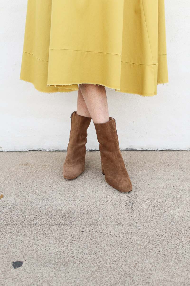 This sleek ankle boot is handcrafted in Italy in suede calf leather for an elegant and enveloping fit. Refined with an elongated almond toe and stacked block heel. Made in Italy.
