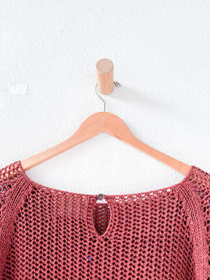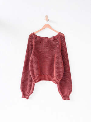 Misha & Puff open knit sweater in maroon cotton has a boxy fit with balloon sleeves and a button closure at the back. Size small. PTP 25" Shoulder to hem 24"