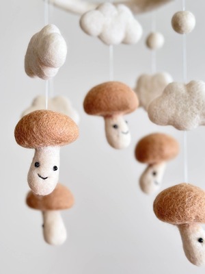 Welcome the forest's magic with our "Smiley Mushroom Baby Mobile." Crafted on a white felt frame, it boasts five smiley beige mushrooms. Playful yet serene, this mobile transforms your nursery into a woodland retreat, sparking your baby's imagination with enchanting forest friends.