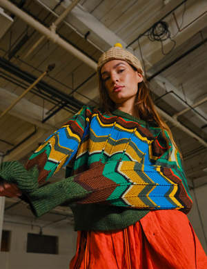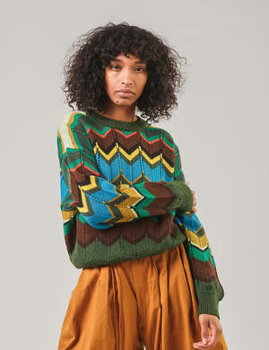 The iconic pattern of this cozy sweater pays homage to the great Missoni house. This colorway features a palette of colors that could be found on a brisk hike in the woods. Details: - By DEGEN - 100% Peruvian Wool - Model wears size S/M - Hand wash cold, air dry - Made by artisans