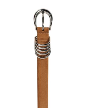 The debut style of Dhanche radiates a subtle yet sophisticated aesthetic that encapsulates the essence of polished dressing. The 5-ring belt is handcrafted in Italy from luxurious calfskin suede with a signature beige suede lining. Shining silver hardwareincluding the buckle, rings, and belt-tipadds polish to any look. HARDWARE DESIGN This belt showcases a trio design composed of a rounded buckle, five demi rings, and a tipped accent. VERSATILE SIZING Features 10 holes to accommodate a broader range of sizes, allowing for styling options both on the hips and slung around the waist. This feature is especially accommodating for those whose body size fluctuates. PERFECT BELT WIDTH The 1-inch width is ideal for wearing through all sizes of belt loops, ensuring a seamless and stylish fit. LUXURIOUS METAL HARDWARE Crafted from zamak, the metal hardware is coated in nickel-free silver that is safe for those with metal allergens. ITALIAN-SOURCED ELEGANCE Smooth calfskin leather, sourced from Italy and certified by the Leather Working Group (LWG), reflects dedication to impeccable quality, sustainability, and ethical sourcing.
