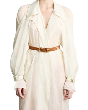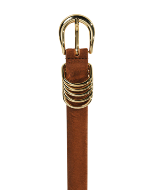 The debut style of Dhanche radiates a subtle yet sophisticated aesthetic that encapsulates the essence of polished dressing. The Hollyhock Belt is handcrafted in Italy from luxurious ponyhair with a signature beige suede lining. It features a 5-ring design with a rounded buckle, 5 demi rings, and a tipped accent, all in shining 24K gold hardware. The belt is crafted from embossed snake calfskin leather, sourced from Italy and certified by the Leather Working Group (LWG), reflecting a dedication to quality, sustainability, and ethical sourcing. The 1-inch width fits all standard belt loops. The metal hardware is made from zamak and coated in nickel-free silver, making it safe for those with metal allergies. Features 10 holes for versatile sizing, allowing for styling on the hips or waist. Made in Italy.