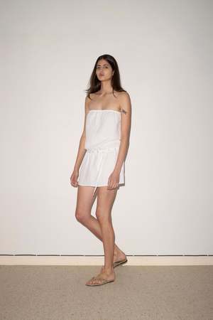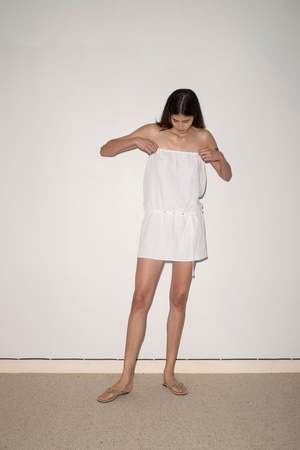 A lightweight, straight cut short length strapless dress featuring an elasticated drop waist and removable press stud belt. Made from 100% GOTS certified organic, OEKO-TEX 100 certified and EU certified stone washed French linen. Measurements in Inches: XXS XS S M L A - Half Bust: 17.7 18.7 19.7 20.7 21.7 B - Half Hem: 20.5 21.5 22.4 23.4 24.4 C - Length CF to Hem: 24.4 24.8 25.2 25.6 26.0