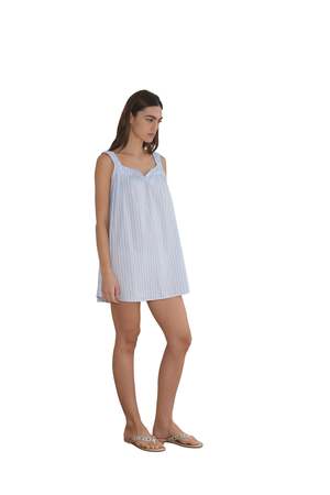 Sweet a-line mini dress features a ruffled square neckline and twin button front in a relaxed silhouette. Made from 100% organic cotton poplin.