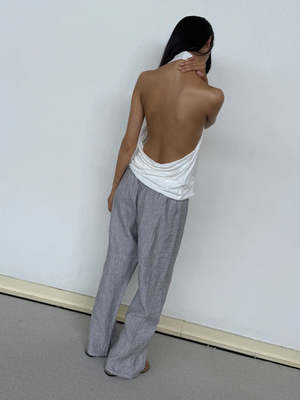 A relaxed mid-waist pant featuring a soft double waist, with an elasticated adjustable tie top waistband, double side seam, and a wide leg. Made from 100% GOTS certified organic, OEKO-TEX 100 certified and EU certified stone washed French linen. Please note this pant runs long in length.