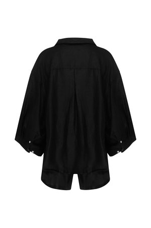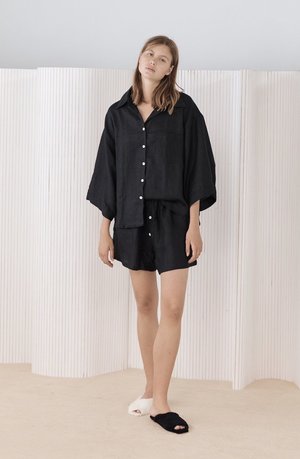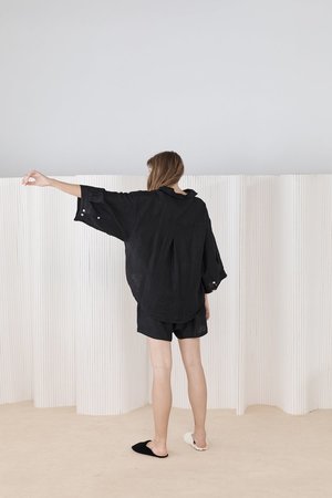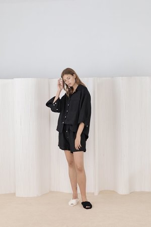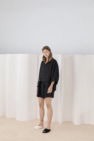 Deiji Studios as a concept is to blend morning into night, daywear into sleepwear. The designers embrace slow fashion and believe we are most confident when dressed comfortably. They are driven by social purpose and the pursuit of an innate sense of style that defies age and time. Deiji Studios uses small, family run factories and works closely with them to ensure good working conditions, fair wages and hours. Their linen is softened by natural pumice stones, all wastewater is recycled and disposed of responsibly, and scrap fabric is donated. The brand is proud to be carbon neutral and based in Byron Bay, Australia. The 03 Set features an oversized box fit linen shirt with wide arms and a front pocket. Designed to sit mid rise, the loose fitting boxer style shorts have a faux button down fly and an elastic waist for comfort. Can be worn at home, in bed, or out. - Deep black color - Size down if in between - Side pockets on shorts - 100% Stone washed French linen - OEKO-TEX 100 certified, GOTS certified organic and EU certified - Measurements across front - - Size XS Top (25" pit to pit, 26" length) - Size XS Shorts (12.5" unstretched - 15.5" stretched, 15" inseam) - Size S/M Top (26" pit to pit 26.5" length) - Size S/M Shorts (14" unstretched - 17.5" stretched, 15.5" inseam) - Size M/L Top (27" pit to pit, 27.5" length) - Size M/L Shorts (15" unstretched - 19" stretched, 15.75" inseam) - The model is 5'8", wearing Size S/M - Christina is 5'5", wearing Size M/L - SKU #DSP1851