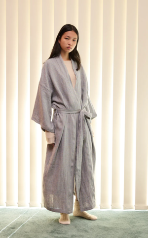 PRODUCT DESCRIPTION An earthy full-length linen robe featuring a waist tie, extra wide sleeves, and low hidden pockets on the side seams. Light a candle, apply a face mask, and lay back in the most chic robe of the season. MATERIAL 100% Stone Washed Linen. OEKO-TEX 100, GOTS, and EU-certified COLOR Field Check SIZE O / S CARE Gentle machine wash in cool or warm water separately prior to use. d D not dry clean. Line dry or tumble dry on a low temperature.