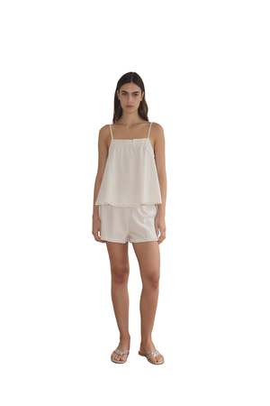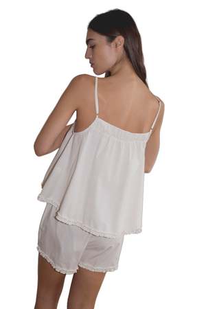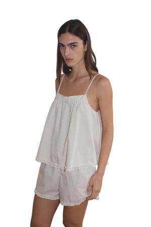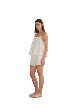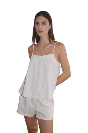 Relaxed babydoll top featuring a flattering straight neckline with button closure, gathered yoke seam, lettuce frill hem detail, and fine adjustable straps. Pairs with an easy pull-on short featuring double button detailing, elastic waistband, and baby lock lettuce frill hem. Made from 100% organic cotton poplin.