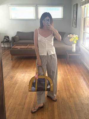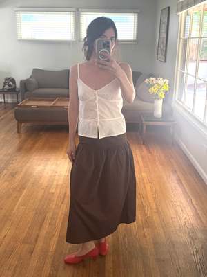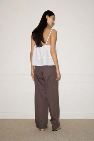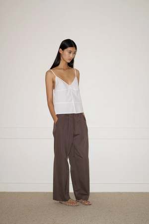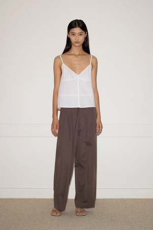 A soft structured top with fixed fine straps and a subtle flared silhouette. Features a button front opening, slight bust gathers, and adjustable straps. Made from 100% GOTS certified organic cotton. Measurements in Inches: XXS XS S M L A - Half Bust: 15.0 15.9 16.9 17.9 18.9 B - Length Apex to Hem: 15.2 15.7 16.1 16.6 17.1 C - Half Hem: 17.9 18.9 19.9 20.9 21.9