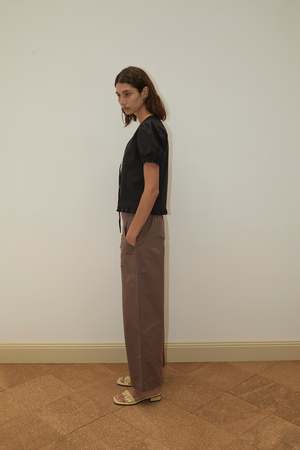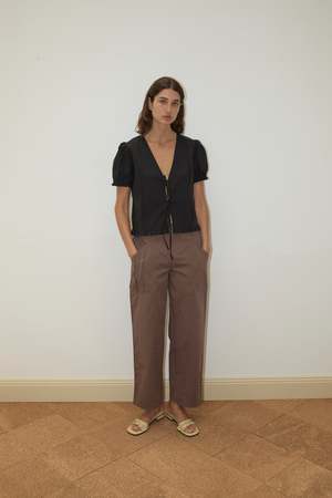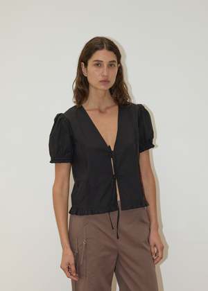 A refined button-up crafted from 100% organic cotton poplin, this top features delicate pintuck detailing along the front, soft blouson sleeves, and subtle frill accents at the cuffs and hem for a gentle, romantic silhouette. The flattering V-neckline with a tie closure adds a light, feminine touch, while the relaxed cut keeps it versatile. Material: 100% organic cotton poplin. Color: Black. Care: Gentle machine wash in cold water with mild soap. Lay flat to dry.